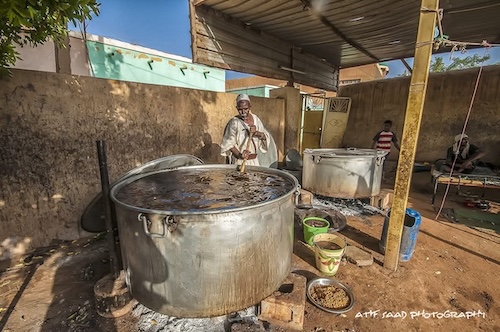 في حجرة الطعام، تعمل مجموعة من النسوة المتفاوتات الأعمار بانهماك على إعداد الطعام للطلبة، يفعلن ذلك تَقرُّباً إلى الله. حيث لا يعد الطعام نشاطاً منزلياً منفصلاً، بل جزءً من منظومة تربوية جماعية تُغرس فيها القيم الروحية والعمليّة معاً. يتقاسم الحيران والطلاب مسؤوليات إعداد الطعام، كلٌّ حسب موقعه الزمني داخل المسيد. فالجُدد يُكَلَّفون بجمع الحطب وتنظيف القدور، بينما يتقدم الآخرون إلى مراحل العواسة وتحضير الكسرة والعصيدة والمشروبات كالحلو مر والآبري الأبيض.